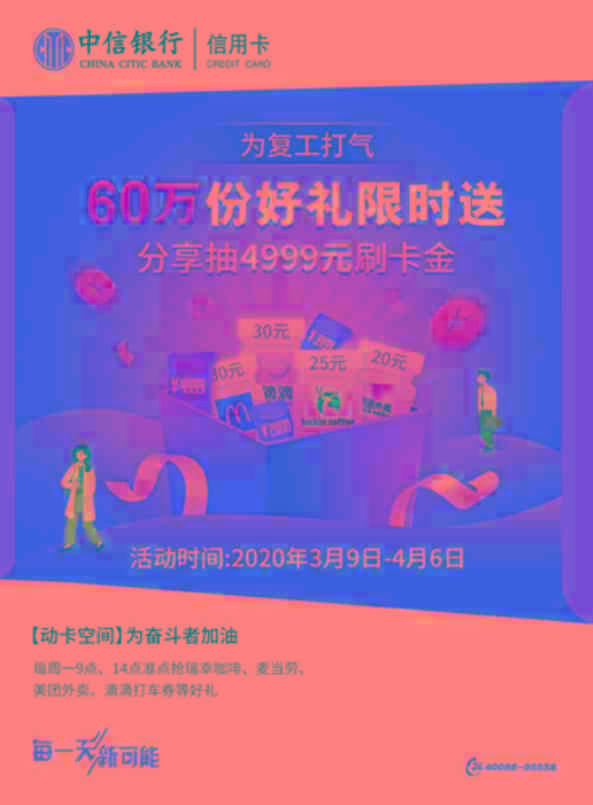 (2020年3月9日,深圳)当前,随着全国复工复产正在有序开展,中信银行(601998,股吧)信用卡中心践行“信守温度”的品牌承诺,在全国各地劳动者陆续返岗之际,关注到广大复工者的消费需求,继今年2月接连推出“9分享兑”、“精彩365”、“9元享看”三大暖心优惠活动之后,本月再度重磅加码,推出“为复工者打气”的专题活动,盛情放送60万份复工礼,以及100份千元刷卡金,为每一名身在路途的复工者加油打气,为每一位回归职场的奋斗者送上暖心的支持和鼓舞!