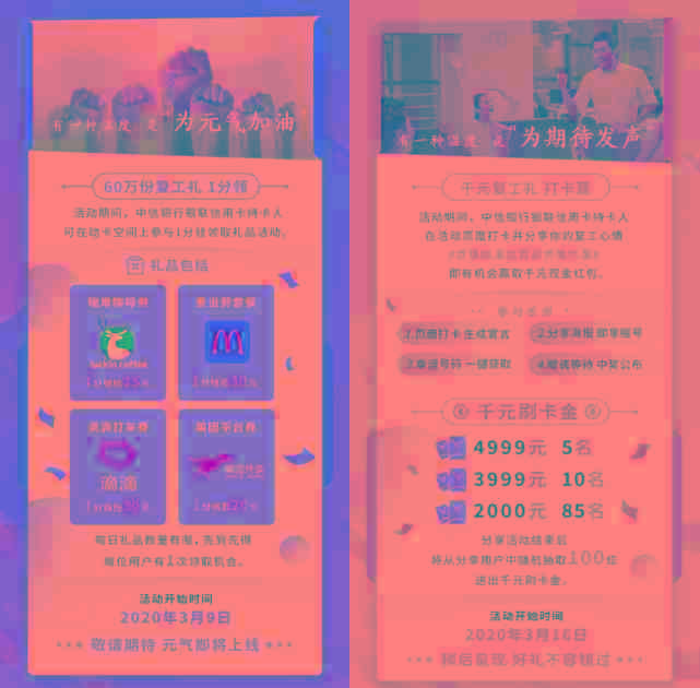 时值全国陆续复工之际,中信银行信用卡实时洞悉广大用户的生活消费需求,充分发挥金融生活服务的整合优势,联合行业知名品牌,为全国复工的奋斗者们送上元气满满的实在鼓励和暖心关怀。未来,中信银行信用卡也将持续在生活消费全场景中为用户带来富有温度的美好生活体验,为奋斗者加油!