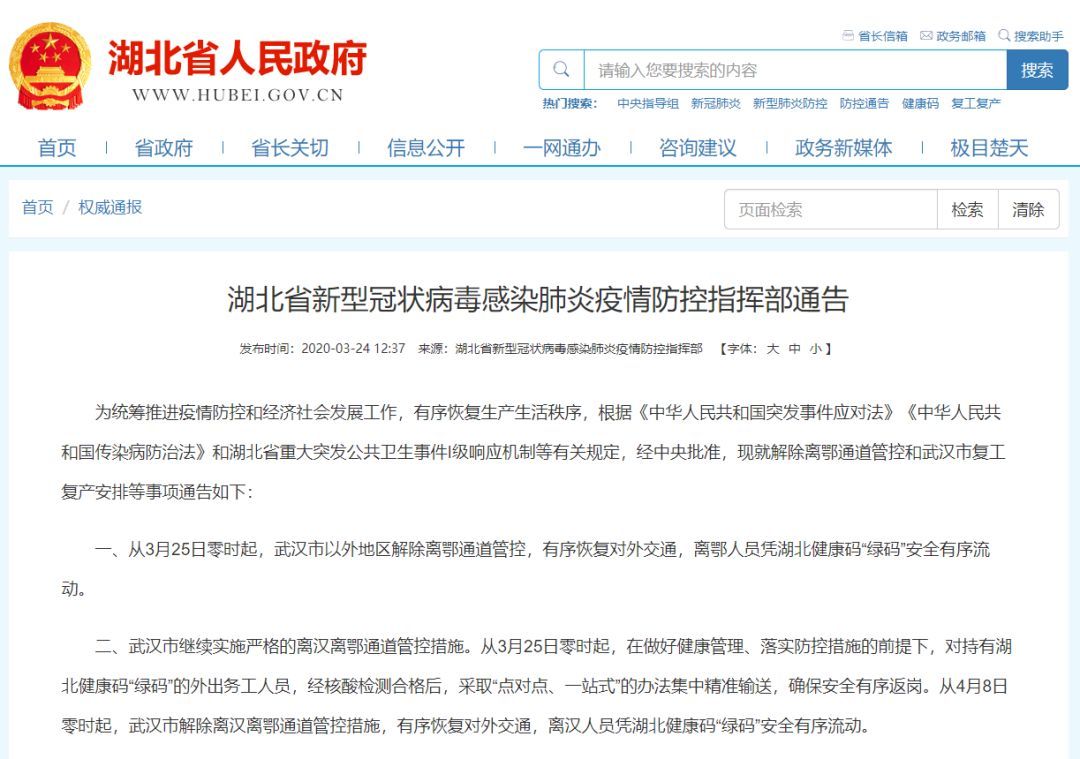 3月24日,湖北省新型冠状病毒感染肺炎疫情防控指挥部发布通告。从3月25日零时起,武汉市以外地区解除离鄂通道管控,从4月8日零时起,武汉市解除离汉离鄂通道管控措施。
