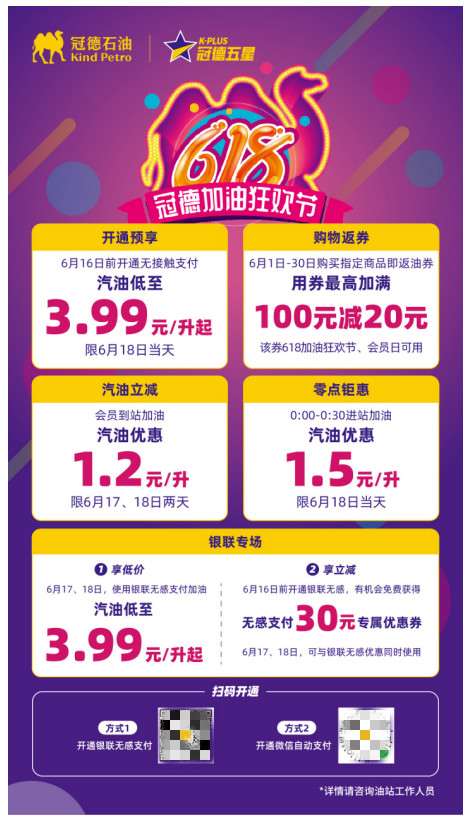 6月1日-15日,在线下便利店或线上商城购买指定商品得返券;6月18日0:00-0:30到冠德加油,享受立减1.5元/升优惠;这个方法也能省更多,不过只有6月18日的凌晨半个小时才有优惠,建议时间凑巧的车主采用。