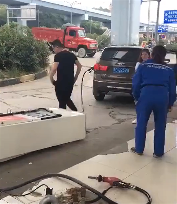 然而让人意想不到的是,加油机的油管质量也是相当过关,车辆拖拽加油管直接把加油机也带倒,甚至加油机被“连根拔起”。