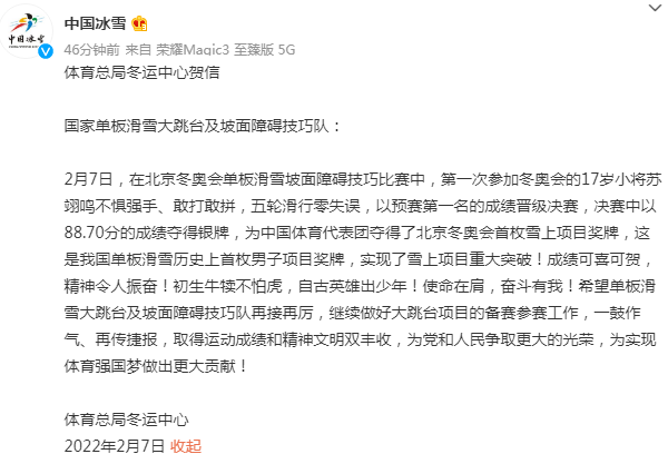 另据“中国冰雪”微博号,北京冬奥会单板滑雪男子坡面障碍技巧决赛,中国队17岁小将苏翊鸣摘得银牌,为中国队创造了该项目历史最好成绩!体育总局冬运中心发贺信祝贺,贺信如下:
