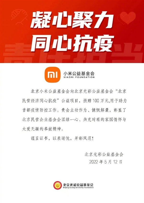 在首都抗疫工作最吃劲的关键时刻,5月12日,北京小米公益基金会向北京光彩公益基金会“北京民营经济同心抗疫”公益项目捐赠100万元,用于助力首都疫情防控工作,守护全民健康。