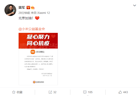 5月12日晚,雷军转发了一条感谢信,并说道“北京加油!”后面@了小米公益基金会。
