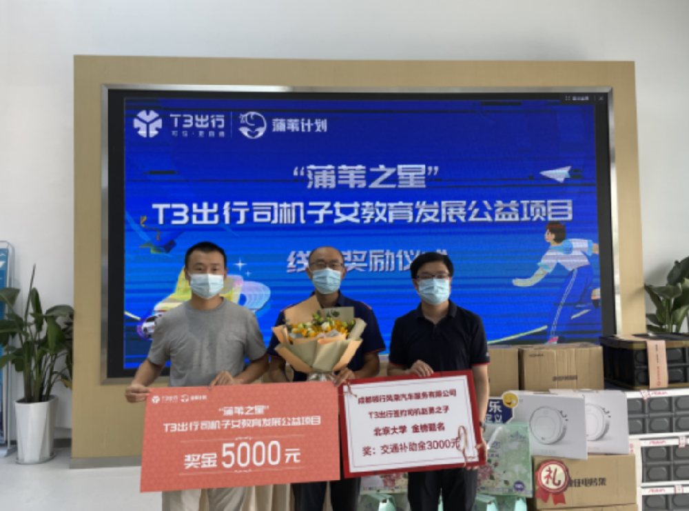 在得知赵勇师傅孩子被北京大学录取的好消息后,T3出行成都分公司为其策划举办了线下表彰大会,在大会现场,赵勇师傅收获了5000元的现金奖励和3000元的交通补助金奖励。分别来自T3出行成都分公司和赵勇所在的运营公司。