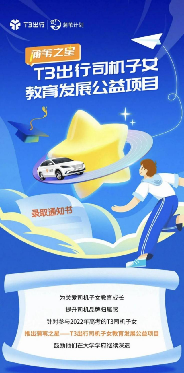“蒲苇之星”正是其中的一项活动,旨在为参与2022年高考并取得优秀成绩的T3出行司机子女提供鼓励与支持。目前,已有近百名司机报名参加该项目,在经过评审后,前5名的司机子女可获得一次性奖励5000元,6-35名也可收获T3出行升学大礼包一份。