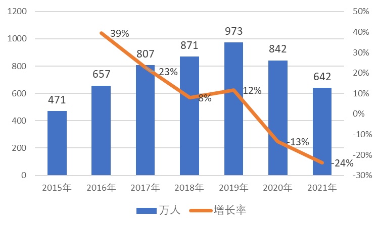 纵观近年来保险传统销售力量经历了“疯狂增长”和“泡沫破灭”的大起大落:2015年保险从业人员资格考试取消,代理人数量从2015年的471万飙升至2019年的973万。随着近两年市场保险需求减弱,监管机构对职业规范严格的背景下,保险代理人数量迅速减少。截至2021年已回落至2016年水平,约为642万人。从几家大型保险公司销售人员策略和市场形势来看,这种“大落”的趋势仍将持续一段时间。