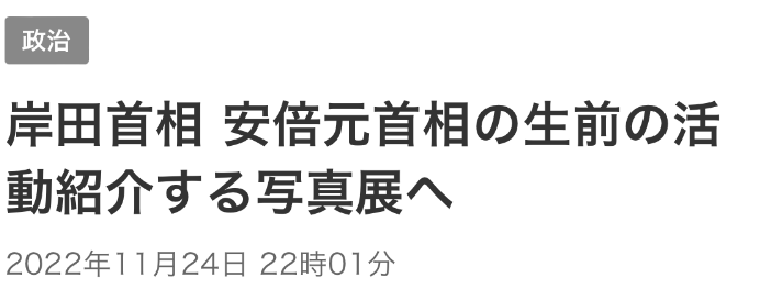 关于“安倍照片展”,岸田在接受记者采访时称,“作为政治家,安倍留下很多成绩”,他是一名“很有魅力的人物”。他还补充称,在参观时,“不知不觉间我有种在与安倍对话的感觉”。“我感到(他)在鼓励我:‘作为首相加油’。”日本《朝日新闻》称,岸田在受访时一度哽咽。