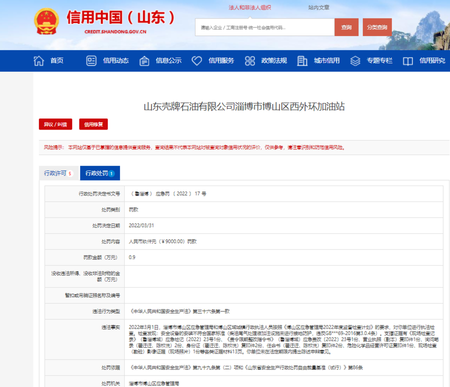近日,信用山东公布了泰安市生态环境局对山东壳牌石油有限公司淄博市博山区西外环加油站行政处罚决定。